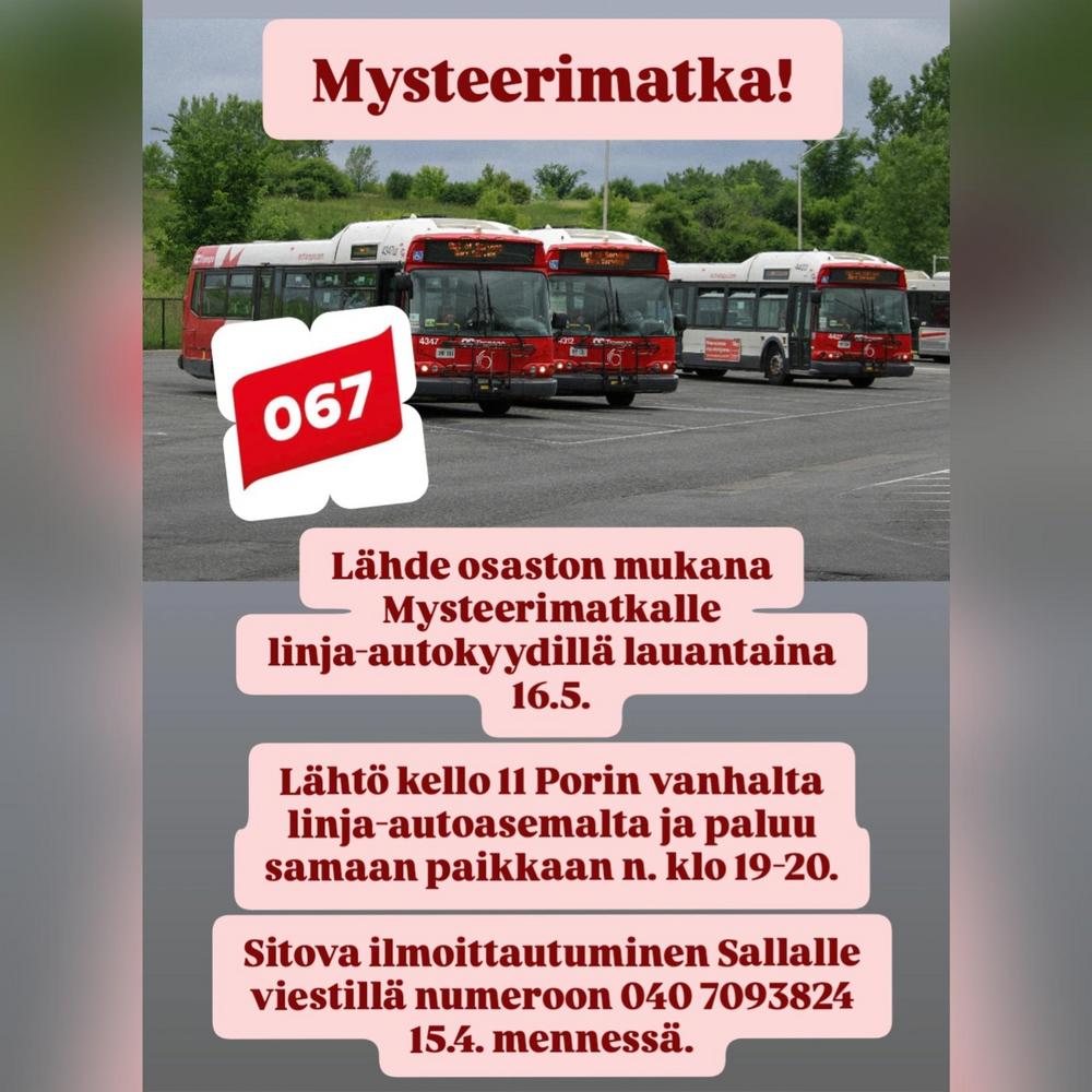 Mysteerimatka linja-autokyydillä la 16.5. Lähtö klo 11 Porin vanhalta linja-autoasemalta ja paluu samaan paikkaan n. klo 19-20. Omavastuu 25€ sisältäen bussimatkan ja ruokailun. Sitova ilmoittautuminen Sallalle viestillä (040 7093824) viim. 15.4.